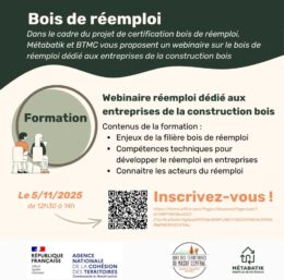 Dans le cadre du projet de certification bois de réemploi, Métabatik et Bois des Territoires du Massif Central (BTMC) proposent un webinaire d’informations sur le bois de réemploi dédié aux entreprises de la construction bois le 5 novembre de 12h30 à 14h00.
